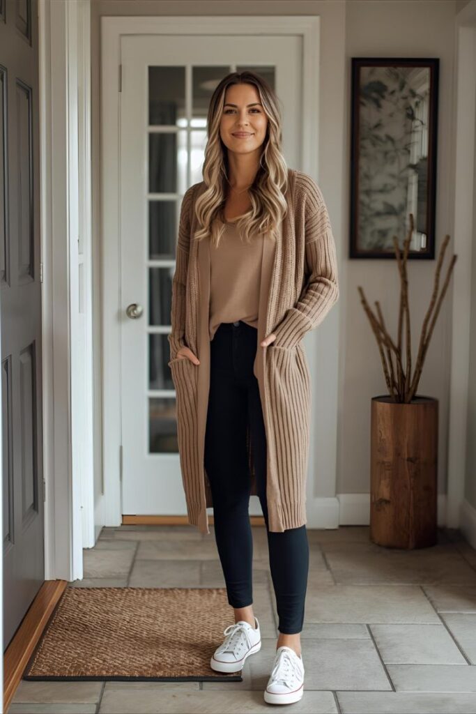 I love wearing these black leggings with a soft cardigan because the extra layer instantly makes the whole outfit feel intentional and put-together, even though it’s incredibly cozy.